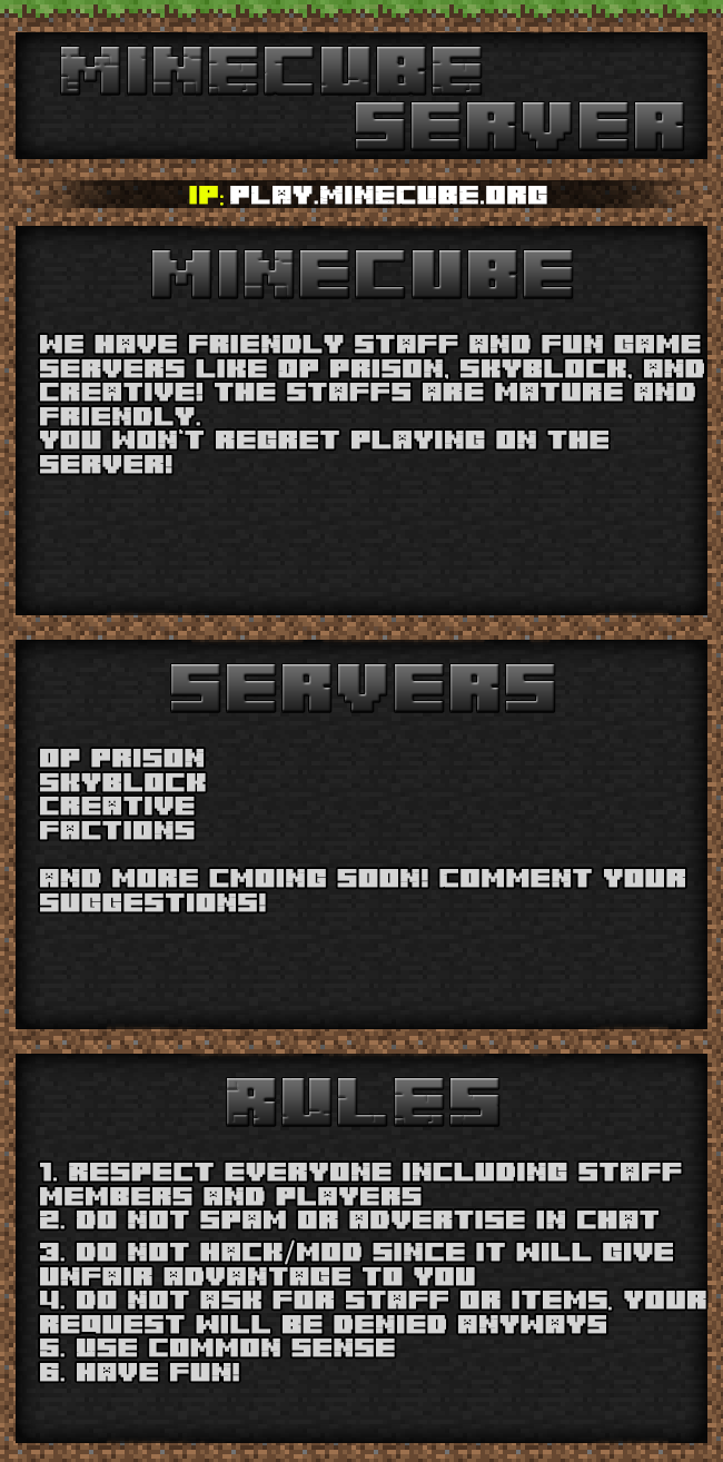 We have friendly staff and fun game servers like Op prison, skyblock, and creative! the staffs are mature and friendly. you won‘t regret playing on the server!